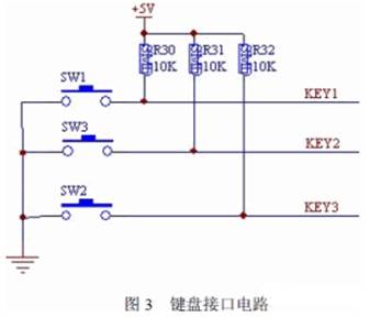 鍵盤接口電路如圖3 所示。鍵盤設計由三個按鍵控製即:“開關”鍵、“+”鍵、“-”鍵, 並外接三個上拉電阻控製鍵盤去抖。此三鍵分別連接到單片機的P1.0、P1.1、P1.2 接口進行控製。