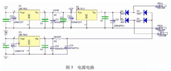 電源部分輸入220V、50Hz 交流電,輸出全機所需的三種電壓:+5V、+15V、-5V,主要供數控部分和D/A 轉換芯片使用;+15V 作為運放的正電源,同時也是穩壓輸出電路的主電源。該電源模塊部分拓展了-5V 負電壓,同時作為運放的負電源,如圖5 所示。