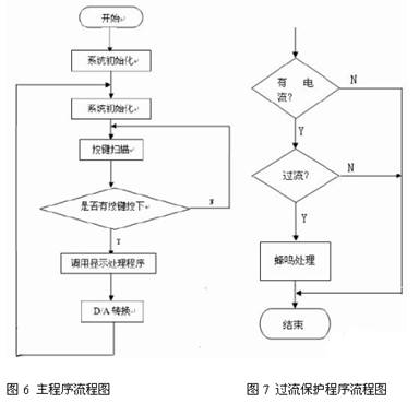 軟件控製程序由主程序和過流保護程序兩部分,其主要實現步進加減、D/A 轉換、鍵盤 掃描、LED 顯示、電流報警等功能。