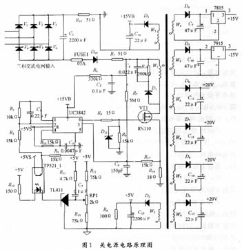+15V電源和-15V電源對控製電路電源精度要求較高,但因為共用同一個變壓器很難通過PWM實現反饋控製來穩壓。為獲得高品質的控製電源,應用線性穩壓芯片7815和7915(如圖1所示)構成了複合式開關穩壓電源。為防止輸出在輕載或空載時的電壓升高,在5 V整流輸出端並聯一個100Ω的負載電阻。