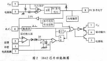 此電源為單芯片集成穩壓電源,PWM芯片采用UC3842。UC3842是一種高性能的固定頻率電流型控製器,是專為脫線式直流變換電路設計的,其內部結構如圖2所示