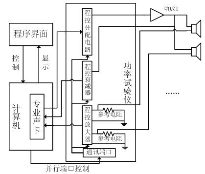 係xi統tong工gong作zuo時shi,應ying用yong程cheng序xu通tong過guo計ji算suan機ji控kong製zhi專zhuan業ye聲sheng卡ka發fa出chu測ce試shi信xin號hao,測ce試shi信xin號hao經jing過guo程cheng控kong分fen配pei電dian路lu激ji勵li多duo路lu功gong放fang,功gong放fang驅qu動dong揚yang聲sheng器qi進jin行xing功gong率lv試shi驗yan。在zai圖tu1中,出於簡化,僅畫出了1路功放,實際工作時,係統最多允許連接4路功放。每路功放可同時連接兩組揚聲器,在功率試驗儀內部配置有對應的2隻(每路有2隻,4路有8隻)dizuzhicankaodianzu,chuanlianzaiyangshengqilianjiehuiluzhizhong,genjudianzuyajiangkejisuanchuyangshengqigongzuodianliu。yangshengqidegongzuodianyahedianliufenbietongguochengkongshuaijianqihechengkongfangdaqijingzhuanyeshengkawanchengA/D變換,通過係統軟件分析得出揚聲器的阻抗,用於判斷出揚聲器的工作狀態。由於專業聲卡同時隻能檢測2路lu信xin號hao,要yao進jin行xing多duo路lu試shi驗yan,必bi須xu采cai取qu循xun環huan掃sao描miao的de工gong作zuo方fang式shi,由you硬ying件jian完wan成cheng通tong道dao切qie換huan,逐zhu個ge通tong道dao進jin行xing檢jian測ce。功gong率lv試shi驗yan儀yi的de設she計ji要yao確que保bao良liang好hao的de精jing度du和he可ke靠kao性xing,內nei部bu硬ying件jian連lian線xian和he布bu局ju要yao合he理li,以yi盡jin可ke能neng降jiang低di幹gan擾rao,參can考kao電dian阻zu的de電dian壓ya較jiao低di,應ying采cai用yong差cha動dong放fang大da器qi放fang大da,以yi提ti高gao共gong模mo抑yi製zhi比bi。此ci外wai,程cheng控kong衰shuai減jian器qi和he放fang大da器qi均jun要yao經jing過guo限xian幅fu電dian路lu再zai和he聲sheng卡ka連lian接jie,以yi防fang損sun壞huai聲sheng卡ka。
