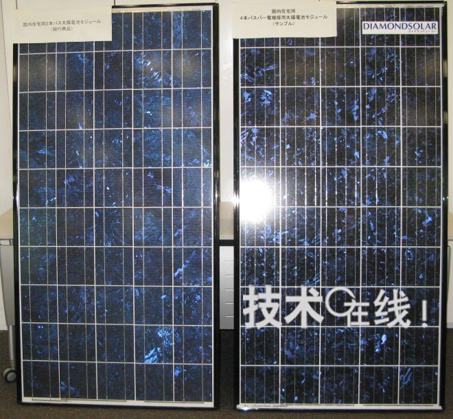 現有的輸出功率185W多晶Si型麵板(左)和將於2010年6月投放日本市場的190W多結晶Si型麵板。通過將各單元上作為電極的總線布線從2根增至4根,提高了輸出功率。