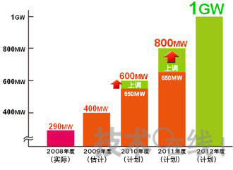 生產計劃方麵,原計劃2010年度產量為550MW,2011年度為650MW。此次將其分別上調至600MW和800MW。另外,力爭2012年度產量達到1GW。以應對日本國內住宅用途及海外大型項目的不斷增加。另外09年度的產量估計為400MW。