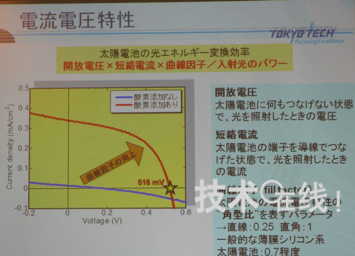 FF值較之前小長井研究小組的0.25有大幅提高,如果不考慮短路電流Isc僅為0.338mA/cm2這一點,I-V曲線呈現的特性與太陽能電池的特性接近。“Isc較小估計是因為電流漏到了取代透明電極的n型結晶矽層上”(黑川)。