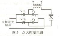點火方式采用脈衝式點火,電路采用倍壓整流電路。圖5示出點火控製電路。全橋逆變器輸出的正向電壓先把VD2導通,給電容C2充電;輸出的負電壓把VD1導通,給C1充電。當每個電容都充電到400V時,可使800V的氣體放電管觸發導通,開始放電。這樣,當變壓器初級產生800V脈衝時,次級就會產生上萬伏的高壓脈衝,從而將高強度的氣體放電管雪崩擊穿。