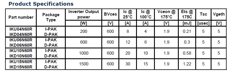 目前這種逆向導通型IGBT有兩種封裝形勢,一種是IPAK封裝,另外是DPAK封裝,電流有4安、6安、10安和15安(an)四(si)個(ge)等(deng)級(ji)。它(ta)主(zhu)要(yao)的(de)特(te)點(dian)就(jiu)是(shi)有(you)非(fei)常(chang)低(di)的(de)價(jia)格(ge),還(hai)有(you)節(jie)省(sheng)空(kong)間(jian)。半(ban)導(dao)體(ti)器(qi)件(jian)它(ta)的(de)成(cheng)本(ben)主(zhu)要(yao)取(qu)決(jue)於(yu)兩(liang)個(ge)方(fang)麵(mian),一(yi)個(ge)是(shi)它(ta)的(de)晶(jing)圓(yuan),減(jian)少(shao)晶(jing)圓(yuan)的(de)數(shu)量(liang),從(cong)兩(liang)個(ge)晶(jing)圓(yuan)減(jian)少(shao)到(dao)一(yi)個(ge)晶(jing)圓(yuan)可(ke)以(yi)減(jian)少(shao)成(cheng)本(ben)。另(ling)外(wai)的(de)話(hua),這(zhe)種(zhong)T0220的封裝還有這種D2PARK封裝可以減少成IPARK封裝和DPARK封(feng)裝(zhuang),同(tong)時(shi)減(jian)少(shao)封(feng)裝(zhuang)的(de)成(cheng)本(ben),減(jian)少(shao)了(le)封(feng)裝(zhuang)的(de)話(hua)同(tong)樣(yang)會(hui)減(jian)少(shao)它(ta)的(de)空(kong)間(jian),但(dan)是(shi)減(jian)少(shao)了(le)晶(jing)圓(yuan)的(de)話(hua)會(hui)不(bu)會(hui)對(dui)它(ta)的(de)性(xing)能(neng)造(zao)成(cheng)影(ying)響(xiang)?首(shou)先(xian)我(wo)們(men)來(lai)看(kan)一(yi)下(xia),同(tong)樣(yang)它(ta)有(you)一(yi)個(ge)非(fei)常(chang)低(di)的(de)飽(bao)和(he)導(dao)通(tong)壓(ya)降(jiang),對(dui)它(ta)的(de)性(xing)能(neng)絲(si)毫(hao)沒(mei)有(you)任(ren)何(he)影(ying)響(xiang)。另(ling)外(wai)可(ke)以(yi)通(tong)過(guo)改(gai)變(bian)門(men)級(ji)驅(qu)動(dong)電(dian)阻(zu),在(zai)寬(kuan)範(fan)圍(wei)調(tiao)節(jie)它(ta)的(de)開(kai)通(tong)和(he)關(guan)斷(duan)的(de)時(shi)間(jian),有(you)一(yi)個(ge)非(fei)常(chang)好(hao)的(de)EMI效果,非常平滑的開關波形,5us的短路保護能力,最高結溫可以達到175度。這個是這種逆向導通型IGBT的主要參數,這個是它的擊穿電壓,這個是它的電流,這是175度飽和導通壓降,這是開關的能力,這是短路保護的能力,這是它的門級驅動電壓,基本上對於一個200W的產品可以選擇4安的IGBT,600W的話可以選擇一個6安的,1000W可以選擇一個10安的,1500W的可以選擇15W的產品。