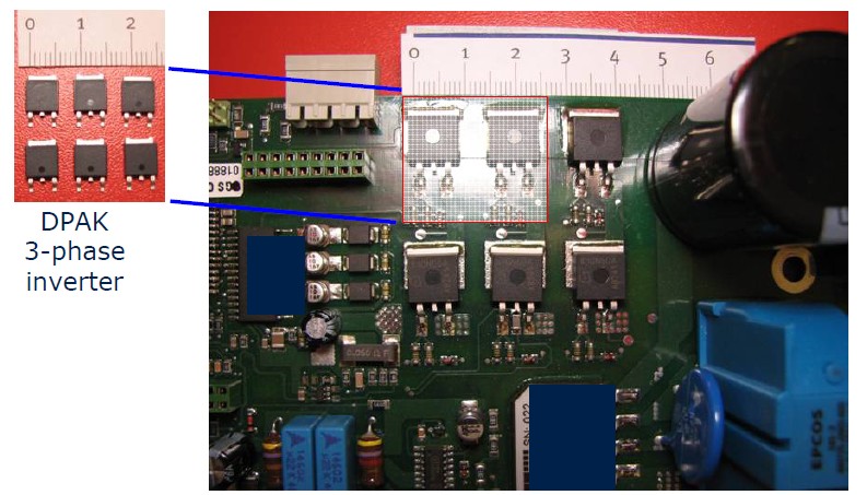 這是一個實際的PCP板上的IGBT的圖,我們看到如果用D2PARK的話,它兩顆的麵積大概在2.5厘米,而如果使用DPARK封裝的話可以減少到1.5厘米左右,同時它跟IGBT模塊來相比的話可以節省0.5個美金的成本,所以對於一些消費類市場低成本的產品這個相當重要的。