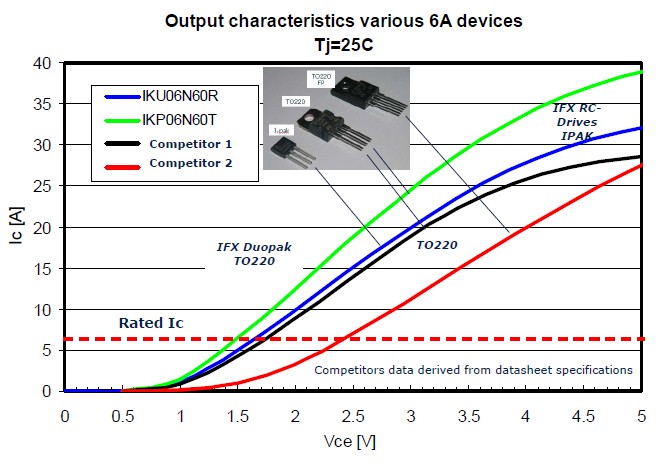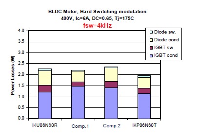 衡量一個IGBT的好壞有兩個非常重要的指標,一個就是它的飽和導通壓降,就是Vce(sat),另外一個就是開關損耗,也就是Eoff。對於低頻的應用來說,飽和導通壓降是占有絕對支配地位的,所以選擇這種RC-Drives的IGBT會是一個非常好的選擇,因為可以看到這種RC-Drives IGBT的飽和導通壓降是遠遠低於市麵上的一些產品。這個是在一個無刷電機上麵的損耗的分析。