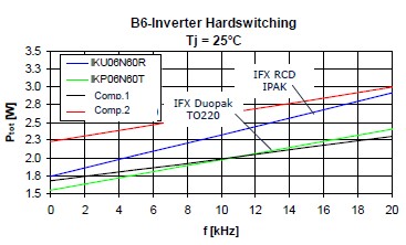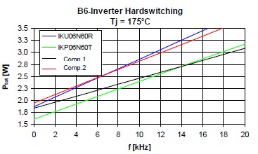 這個是25度損耗的時候,這個是175度損耗的時候,可以看到藍色的這根線,基本上它的損耗跟這個TO220封裝產品相差並不是很大。這個是在基於剛才基礎上做的一個損耗分析,首先頻率在4K赫茲的時候可以看到,這個淺藍色的就是二極管的開關損耗,這個是二極管的導通損耗,這個是IGBT的開關損耗,這個是IGBT的導通損耗。可以看到在4K的情況下導通損耗這一部分和這一部分是占了絕對支配地位的。所以對於一個低頻應用來說減少它的飽和導通壓降對於IGBT是相當的重要,當它的頻率升高的時候,它的開關損耗就會稍微升高一點。