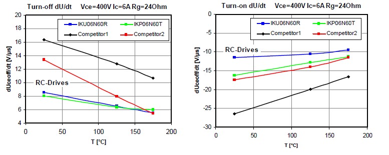 EMI也是大家非常頭痛的一個問題,也是非常關心的一個問題。逆向導通型IGBT同時優化了它的EMI的性能,它有一個非常好的開關,非常平滑的一個開關特性,不會有一個很大的振動,幹擾。所以我們可以看到它的關斷和開通的時候dV/dt的現象,基本上在關斷的時候dV/dt基本上控製在一個10V/us的情況,而在開通的時候基本上也可以控製在—10V/us。