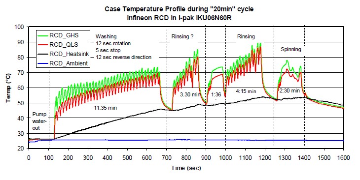 下麵就是為了驗證這種逆向導通型IGBT在實際應用當中的一個表現,我們在一個洗衣機上麵驗證了6安的IPARK的產品,在一個風機上麵我們驗證了6安的DPARK的產品。這是一個實際的洗衣機的控製板,這種方式就是采用了夾子,然後把這個IGBT夾在散熱器上麵。稍候我們會用這種IPARK的封裝對這種TO220的封裝做一些替代,然後比較一下他們的不同。就是說我們把其中的一路替代成IPARK產chan品pin,然ran後hou做zuo一yi個ge效xiao率lv還hai有you溫wen度du的de檢jian測ce,通tong過guo這zhe種zhong熱re電dian偶ou的de方fang式shi來lai檢jian測ce它ta的de表biao麵mian溫wen度du,來lai檢jian測ce它ta的de結jie溫wen。因yin為wei它ta外wai麵mian有you一yi個ge夾jia子zi,我wo們men沒mei有you辦ban法fa用yong紅hong外wai相xiang機ji來lai檢jian測ce它ta的de溫wen度du,所suo以yi我wo們men采cai用yong了le這zhe種zhong熱re電dian偶ou的de方fang式shi。這zhe個ge是shi洗xi衣yi機ji的de工gong作zuo流liu程cheng,首shou先xian的de話hua是shi抽chou水shui,這zhe個ge是shi洗xi滌di,這zhe個ge是shi漂piao洗xi,這zhe個ge是shi甩shuai幹gan,整zheng個ge20分鍾的流程當中它的溫度的表現,基本上它的最高溫度沒有超過90度,我們可以看到這個綠色和紅色有一點稍微小小的區別,這是因為它的散熱不一樣,IGBT的位置放在不一樣,所以會有一點不一樣,這個不用太過擔心。