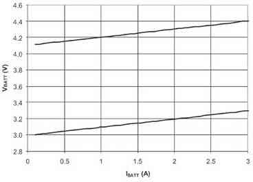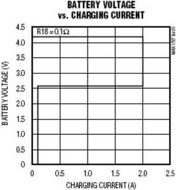 圖1為用於鋰離子電池充電器的CC-CV集成電路(MAX1737)的V-I特性曲線。這種類型的IC是消費類產品中所有鋰離子電池充電器的核心。圖中可清楚看出CC(2.6V至4.2V電池電壓)和CV(4.2V)區域。