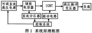 係統工作過程如下:由控製係統控製可調直流高壓電源給儲能電容器充電,當充電電壓達到設定值後,再控製IGBT按(an)照(zhao)設(she)定(ding)的(de)頻(pin)率(lv)和(he)脈(mai)衝(chong)寬(kuan)度(du)導(dao)通(tong),產(chan)生(sheng)脈(mai)衝(chong)電(dian)壓(ya)加(jia)在(zai)高(gao)壓(ya)脈(mai)衝(chong)變(bian)壓(ya)器(qi)原(yuan)邊(bian),最(zui)後(hou)由(you)高(gao)壓(ya)脈(mai)衝(chong)變(bian)壓(ya)器(qi)升(sheng)壓(ya),產(chan)生(sheng)所(suo)需(xu)的(de)高(gao)壓(ya)脈(mai)衝(chong)加(jia)在(zai)負(fu)載(zai)上(shang)。