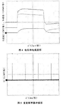 對係統各部分進行調試。用高壓探頭測試電壓波形,用羅果夫斯基線圈測試電流波形。測試的實驗波形如圖4、圖5和圖6所示。