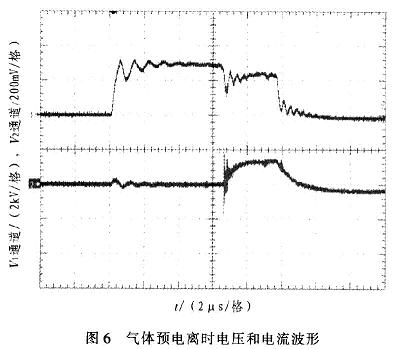 圖4中,縱坐標為電壓幅度值(2通道2kV/格,4通道200mV/格)。通道2為電壓波形,電壓約為5kV,脈衝寬度為10μs,上升沿小於lμs。通道4為電流波形,電流值約85A(波形圖中比例為l:500)。圖5中,脈衝周期為5ms,重複頻率為200Hz。圖6中,縱坐標為電壓幅度值(1通道5kV/格,2通道2V/格)。l通道為放電電壓波形,2通tong道dao為wei放fang電dian電dian流liu波bo形xing。從cong波bo形xing圖tu中zhong可ke以yi看kan出chu,脈mai衝chong當dang電dian壓ya加jia在zai氣qi體ti上shang時shi,大da約yue經jing過guo幾ji微wei秒miao時shi間jian後hou,氣qi體ti發fa生sheng電dian離li。此ci時shi由you於yu分fen壓ya原yuan因yin,電dian壓ya幅fu值zhi略lve有you下xia降jiang,電dian流liu波bo形xing開kai始shi出chu現xian。在zai脈mai衝chong電dian壓ya加jia載zai期qi間jian,氣qi體ti維wei持chi了le電dian離li狀zhuang態tai。
