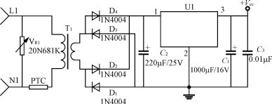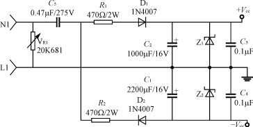 單相純計量表一般隻含有一個基本的計量單元,一個電子計度器,一個發光二極管和脈衝輸出口等,整機耗電一般不超過50mW,采用低成本的串聯阻容降壓電路即可滿足整個電度表的供電需求;有的計量IC隻需要單一+5V電源供電,如ADE7755等,如圖1所示。而有的計量IC需要±5V或±2.5V雙電源供電,如BL0932、SA9602M等,如圖2所示。