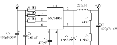 如果保證在最低輸入電壓70%Rn時電表能輸出正常的工作電壓,按線性變壓器特性,則在額定輸入電壓Un時,輸出電壓會較高,如果輸出電壓整流濾波後采用一般的線性穩壓器供電,將會使整機功耗加大;而在最高輸入電壓時,將會使變壓器溫升增大,線性穩壓電路損耗加大,發熱量也會增大;針對整機耗電較大的電子電度表,其解決辦法一是可以采用較好材質的矽鋼片,如Z11型矽鋼片;二是低壓輸出穩壓電路采用一個低成本的高效率DC/DC變換電路,即可使整機功耗顯著降低,還可在寬輸入電壓範圍內,穩定、高效地工作。這些DC/DC電路可以采用簡單的低成本MC34063、LM2574等DC/DC變換器,采用MC34063設計的+5V輸出DC/DC變換器如圖3所示。