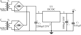 三相電度表有三相三線,三相四線,輸入電壓有3×(220~240)V/380~400V、3×57V/100V等。三相電度表供電電路可以參考單相電度表電源的設計方法,對於三相四線供電電路,可以在每一相線對零線之間接1隻線性變壓器,共3隻線性變壓器;對三相三線可以取一相如Β相作為公共地線,A、C相對Β相接2隻線性變壓器。這些變壓的副邊單獨整流後再將輸出的正極接在一起、負極接在一起,經電容濾波後,再通過DC/DC變換器輸出穩定電壓,向電度表供電,如圖5所示。