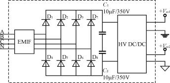 這(zhe)種(zhong)供(gong)電(dian)方(fang)式(shi)體(ti)積(ji)和(he)重(zhong)量(liang)較(jiao)大(da),成(cheng)本(ben)也(ye)較(jiao)高(gao),顯(xian)然(ran)按(an)以(yi)上(shang)電(dian)路(lu)連(lian)接(jie)時(shi),對(dui)三(san)相(xiang)四(si)線(xian)供(gong)電(dian)時(shi)不(bu)能(neng)缺(que)零(ling)線(xian),對(dui)三(san)相(xiang)三(san)線(xian)供(gong)電(dian)時(shi)不(bu)能(neng)缺(que)公(gong)共(gong)地(di)線(xian),如(ru)B相;另外,有的供電局用戶要求,三相電度表輸入端任意兩線有電壓輸入時都能工作,則圖5的設計便不能達到目的;當采用三相電度表專用開關電源模塊供電時,可解決以上問題,其內部結構圖如圖6所示。