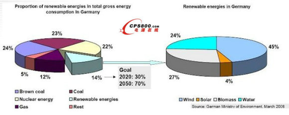 歐洲是現代能源和氣候政策的先驅,德國是利用新能源技術方麵一個最好的例證。鑒於到2020年,要實現減少14%的二氧化碳排放量(與2005年的排放量相比)的目標,到2020年可再生能源在初級能源消耗中的比例要增加到18%(2005年為6%)。對於德國總電力消費來說,這意味著到2020年可再生能源的份額將增加一倍,如圖2所示。展望未來,到2050年計劃可再生能源的份額達到70%。