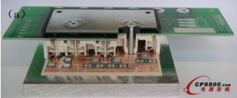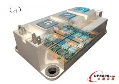圖3不同功率模塊的剖麵圖;(a)標準IGBT半橋模塊;(b)智能功率模塊(IPM),包含半導體芯片、絕緣材料、帶保護傳感器的驅動器、電流傳感器和散熱器。