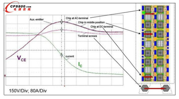 最後一點值得考慮的是新SKiM模塊的內部機械設計。圖6xianshilebiaoyouxinpianweizhidetaocichendidebuju。yaozhuyibujudegaoduduichengxing。zaiyoucekeyikandaotongshiyebanyanjixieyajiexitongjiaosedeneibugonglvmuxian。cengzhuangmuxianheliujingmeigexinpiandedianliuzhijieshideDC+和DC端子之間的雜散電感不到20nH。至於IGBT的關斷,對於不同位置的芯片,沒有發現任何的差別。