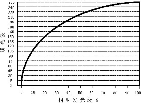 DALI可提供如圖1所示的對數256級(ji)調(tiao)光(guang)特(te)性(xing),即(ji)使(shi)在(zai)較(jiao)亮(liang)的(de)照(zhao)明(ming)環(huan)境(jing)條(tiao)件(jian)下(xia),調(tiao)光(guang)級(ji)變(bian)化(hua)較(jiao)大(da),反(fan)之(zhi)變(bian)化(hua)較(jiao)小(xiao),這(zhe)種(zhong)非(fei)線(xian)性(xing)的(de)對(dui)數(shu)非(fei)線(xian)性(xing)調(tiao)光(guang)相(xiang)對(dui)於(yu)人(ren)眼(yan)的(de)視(shi)覺(jiao)特(te)性(xing)為(wei)線(xian)性(xing)變(bian)化(hua)規(gui)律(lv)。調(tiao)光(guang)效(xiao)果(guo)很(hen)適(shi)應(ying)人(ren)眼(yan)的(de)視(shi)覺(jiao)特(te)性(xing)。
