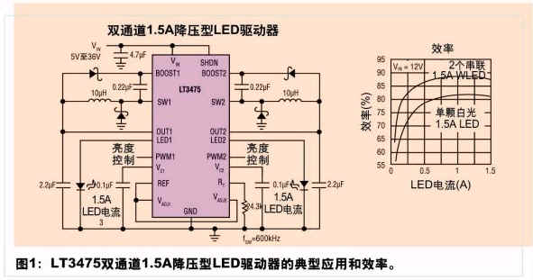 憑借其4V至36V(瞬態電壓高達40V)的寬輸入電壓範圍,LT3475成為了汽車電源係統的理想選擇。其開關頻率可被設定在200kHz至2MHz之間,因而允許使用纖巧型電感器和陶瓷電容器,並使開關噪聲遠離AM無線電波段。再加上采用了一種耐熱增強型TSSOP-20封裝,該器件提供了一款適合於驅動高電流LED的緊湊型解決方案。