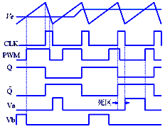 SG3525芯片各點的工作波形如圖3所示,由誤差放大器輸出的電壓Ve與鋸齒波的交點可得一負的PWM信號。由PWM信號、時鍾信號及分相器輸出的Q(或)信號,根據或非門的邏輯可得兩個或非門的輸出信號Va和Vb。由波形圖可以看出,PWM比較器的反相輸入端電平越高,輸出脈衝Va和Vb的占空比越大;反之越小。根據這一規律來實現該控製器的調壓、軟啟動及保護功能。另外,可以通過改變5腳和7腳之間的外接電阻的大小,使時鍾脈衝寬度變化來實現死區大小的調節。