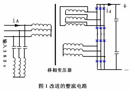 采用如圖1所示的12脈波整流電路,移相30°構成串聯2重結電路,利用變壓器二次繞組接法的不同,使兩組三相交流電源間相位錯開30°,從而使整流輸出電壓在每個交流電源周期中脈動12次,故為12脈波整流電路。變壓器二次繞組分別采用星形和三角形接法構成相位角相差30°、大小相等的兩組電壓,接到相互連接的整流橋上。