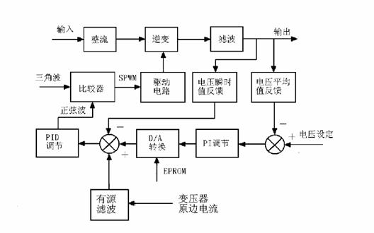 由於在輸出變壓器中,勵磁電流一般僅占原邊電流的2%,因yin此ci原yuan邊bian電dian流liu直zhi流liu分fen量liang的de檢jian測ce必bi須xu首shou先xian濾lv除chu勵li磁ci電dian流liu中zhong的de基ji波bo及ji高gao頻pin成cheng分fen,然ran後hou再zai將jiang剩sheng下xia的de直zhi流liu分fen量liang放fang大da後hou用yong於yu控kong製zhi。勵li磁ci電dian流liu中zhong直zhi流liu分fen量liang的de提ti取qu可ke先xian由you霍huo爾er電dian流liu傳chuan感gan器qi檢jian測ce變bian壓ya器qi的de原yuan邊bian電dian流liu,再zai經jing有you源yuan濾lv波bo,最zui後hou送song到daoPID調節器中,其雙閉環控製原理框圖為如圖3所示。