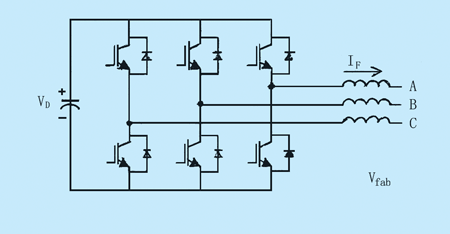 帶自控直流母線的並聯APF,有一類似於靜態補償器(STATCOM)的拓撲,STATCOM是用於電力係統中補償無功功率的。並聯的APF,以注入相等而反向的諧波電流對負荷電流的諧波進行補償。此時,並聯APF是作為注入諧波分量的電流源而工作的,諧波分量由負荷產生,但已移相180o。圖4為並聯APF的接線圖,圖5表示APF補償的工作原理。為能輸出圖5所示濾波器電流波形的IF,需要設置圖4中的控製電路,以便產生圖6所示的Vfab脈寬調製電壓圖。