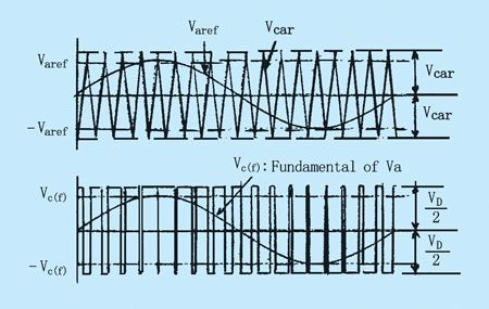 為產生任意波形的交流電壓,將PWM技術應用到直流母線電壓斬波的電壓源逆變器上。現有很多能組成正弦波或任意波形的PWM技術,利用PWM技術,不僅允許控製逆變器作為電壓源,也可作為電流源以控製濾波器的交流輸出。圖2為所利用的最普通的三角載波(TC)技術,這是最簡單的線性控製方法,是將有固定幅值的和固定三角波的輸出電流誤差進行比較。迫使開關周期內的輸出電壓Va限定於Vcar的載波周期內,並等於調製波Varef的平均幅值。正弦調製波的合成電壓含正弦基波分量Va(f)和不希望的諧波分量,利用盡可能高的頻率載波,可使這些不想要的諧波成分減到最小,但這取決於半導體功率器件(IGBT、GTO或IGCT)的最大開關頻率。