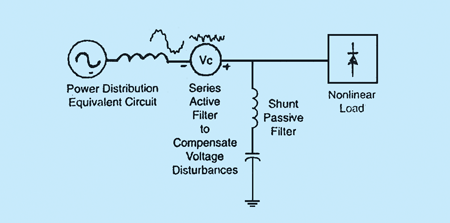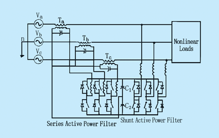 串聯型APF是從1980年未引用於電網的,它主要作為電壓調節器及電網與非線性負荷之間的諧波隔離器而工作的。圖7為串聯APF的接線圖,通過匹配變壓器將APF串聯於電源和負荷之間,以消除電壓諧波、pinghenghuotiaozhengfuhededuandianya,kequebaoyonghugongdiandedianyazhiliang,youqishiheyubuchangjiaoliudianyuanjixiaogonglvyingyongzhongdedianyabupinghengyudianyadexiaxian。yinbuxunengliangzhubei(蓄電池),元器件的總定額較小,對UPS更為經濟有效。串聯APF注入與電源電壓串聯的電壓分量,故可視為一可控的電壓源,補償負荷側的電壓下陷和上凸。但串聯型APF損耗較大,且各種保護電路也較複雜,故很少單獨使用。經常用它與無源LC濾波網絡組成混合型APF。