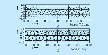 如圖7所示,無源LC濾波器與負荷並聯,串聯型APF的工作如同一台諧波隔離器,迫使負荷電流諧波主要通過無源濾波器循環,而不經過配電係統。此方案的優點是:串聯APF的額定功率僅為負荷定額(KVA)的一小部分,通常為5%。但在電壓補償時,串聯APF的視在功率定額可能增加。圖8是串聯濾波器為補償負荷側電壓諧波的工作原理圖。串聯APF還可用於抗基波電壓的幹擾。圖9所示為電源電壓偶然跌落時串聯APF所起的作用。如圖8所示,負荷電壓幾乎保持恒定,僅在電源電壓跌落的起始和最後瞬間,出現了很小的不穩定和振蕩。