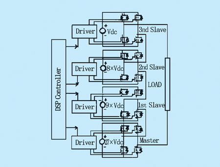 多級逆變器應能建立多級的電壓,故輸出電壓的質量更佳。基於多段連接的“H”型變換器,並增配有3級(ji)不(bu)同(tong)的(de)直(zhi)流(liu)電(dian)壓(ya)源(yuan),這(zhe)是(shi)產(chan)生(sheng)很(hen)多(duo)級(ji)電(dian)壓(ya)的(de)最(zui)新(xin)方(fang)法(fa)。利(li)用(yong)該(gai)技(ji)術(shu),僅(jin)需(xu)很(hen)少(shao)幾(ji)個(ge)串(chuan)聯(lian)變(bian)換(huan)器(qi)即(ji)能(neng)獲(huo)得(de)很(hen)好(hao)的(de)電(dian)壓(ya)波(bo)形(xing)。在(zai)脈(mai)寬(kuan)調(tiao)製(zhi)的(de)同(tong)時(shi),又(you)能(neng)調(tiao)幅(fu)。圖(tu)12所示,僅以每相4個“H”變換器(4段逆變器)就可產生81級電壓的調幅,故可實現“無諧波”的APF特性。圖13為在實驗室完成的“4段81級”並聯型有源電力濾波器。