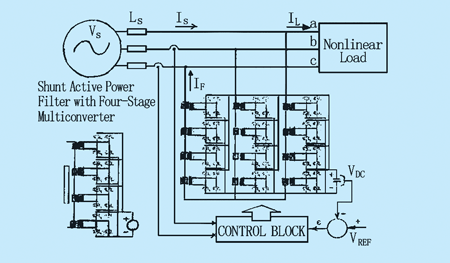 一直處於研究階段的多級逆變器,最近被用於APF拓撲中,圖11為配有三級逆變器的並聯APF,今天在大多數的逆變器應用領域,三級逆變器已愈益普及,例如功率因數補償器。多級變換器的優點是能降低APF產生的諧波含量。因與普通變頻器比較,能輸出更多(>2級)的電壓,這一特點有利於減少濾波器本身產生的諧波。另一優點是能減少半導體電壓或電流的定額,以及減少所需的開關頻率。