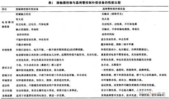 利用接觸器控製補償設備與用晶閘管控製方法來補償設備的性能比較如表1所列。