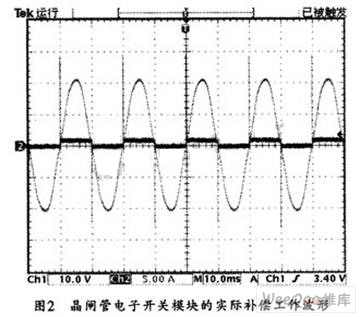 在無功補償實際應用中,可將晶閘管電子開關模塊用在TSC低壓無功補償以替代接觸器,這樣,就可以在開關電壓過零時投入補償電容量,從而避免了衝擊電流的產生和瞬間電網電壓的波動。圖2所示是其工作波形圖。