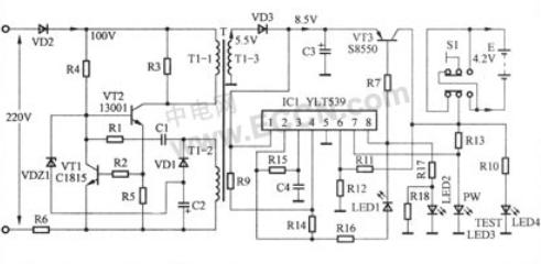 該電路主要由一塊軟塑封集成塊IC1(YLT539)和三極管VT3等組成。從變壓器T的1-3繞組感應出的交流電壓5.5V經二極管VD3整流、電容C3濾波後,輸出一個直流8.5V左右電壓(空載時),該電壓一部分加到三極管VT3的e極;另一部分送到軟塑封集成塊IC1(YLT539)的1腳,為其提供工作電源。集成塊IC1有了工作電源後開始啟動工作,在其8腳輸出低電平充電脈衝,使三極管VT3導通,直流8.5V電壓開始向電池E充電。