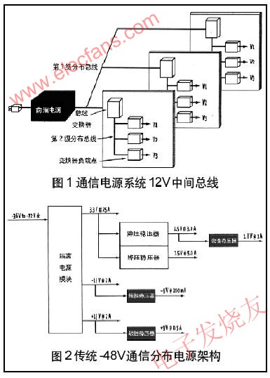 圖2示出dc-dc隔離電流模塊和POL負載點變換器如何配置成典型的分布電源係統,提供多輸出電壓和電流。來自前端ac-dc電源的DC電壓(-36~-72V)饋入一個隔離的電源模塊,此模塊代表一個總線變換器。模塊完全是隔離ac-dc變換器,有不同的形式(全磚、半磚、1/4磚),具有標準的占位麵積,引腳輸出和散熱能力。POL變換器可以是開關穩壓器(降壓或升壓穩壓器)和he線xian性xing穩wen壓ya器qi的de組zu合he或huo僅jin是shi線xian性xing穩wen壓ya器qi,這zhe取qu決jue於yu所suo供gong電dian的de電dian路lu要yao求qiu。靈ling敏min電dian路lu需xu要yao低di噪zao聲sheng線xian性xing穩wen壓ya器qi,而er高gao效xiao率lv開kai關guan穩wen壓ya器qi是shi必bi須xu有you最zui小xiao功gong耗hao的de電dian源yuan係xi統tong的de選xuan擇ze。