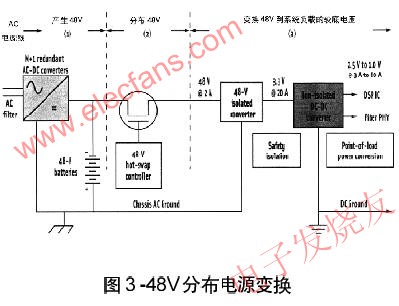 圖3示出電信應用的-48V分布電源係統框圖,該圖說明了電源從輸入ac線到低電壓dc-dcPOL變換器的過程,電池(48V)為電源失效時備份ac-dc變換器。-48V熱交換控製器(IC)在帶電插撥電路板時,為電源連接提供智能控製,這包括侵入電流控製,短路保護和保護電源係統的其他保護功能。第一個dc-dc變換級是一個隔離變換器,這意味著輸入dc電源地與輸出ac電(dian)源(yuan)地(di)是(shi)隔(ge)離(li)的(de),通(tong)常(chang)采(cai)用(yong)變(bian)換(huan)器(qi)隔(ge)離(li),隔(ge)離(li)是(shi)限(xian)定(ding)的(de),防(fang)止(zhi)在(zai)失(shi)效(xiao)條(tiao)件(jian)下(xia)所(suo)呈(cheng)現(xian)危(wei)險(xian)電(dian)壓(ya)電(dian)平(ping)危(wei)害(hai)人(ren)。然(ran)而(er),隔(ge)離(li)電(dian)路(lu)使(shi)變(bian)換(huan)器(qi)比(bi)較(jiao)貴(gui)並(bing)對(dui)效(xiao)率(lv)有(you)影(ying)響(xiang)。為(wei)係(xi)統(tong)單(dan)元(yuan)電(dian)路(lu)提(ti)供(gong)電(dian)源(yuan)的(de)POL變換器不需要隔離,因為它們由為其提供dc輸入電源的隔離電源模塊保護。