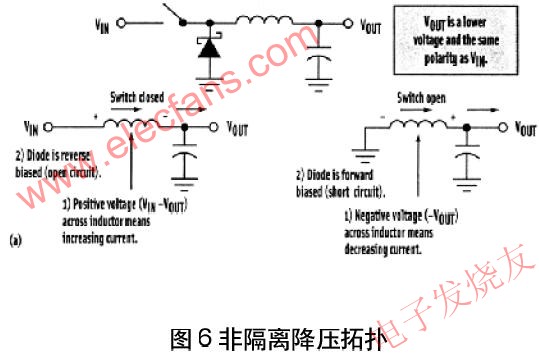 降壓變換器是構成大多數開關變換器架構基礎的基本拓撲。它是最通用的拓撲,在分布電源係統中會用到這種拓撲,因為必須變換高dc電壓(48V)到較低的電壓,而且功耗小。開關是一個功率晶體管(通常是MOSFET),其柵極由執行脈寬調製(PWM)的IC驅動它控製占空比(晶體管的開關時間),從而控製輸出電壓大小。圖6示出非隔離降壓拓撲。