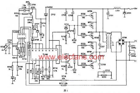 運放A1作為過流保護用,6腳由TL494的14腳提供5V參考電壓。正常情況下,P/T端為高電平,5腳為低電平,所以7腳輸出低電平,TL494的16腳也為低電平。當由於運放出現過流或其它原因而使P/T端檢測到低電平時,5腳為高電平,且高於6腳參考電平,7腳便輸出高電平,保護動作。運放A2作為開機保護和過熱保護用,同相輸入端3腳電壓由控製電壓12V經兩電阻R707和R709分壓獲得。反相輸入端電壓由R710和熱敏電阻R708分壓獲得。R708在常溫下阻值為100kΩ左右,2腳電平高於3腳電平,1腳便輸出低電平。當溫度升高到近100℃時,熱敏電阻阻值降為低於10kΩ。2腳電平低於3腳電平,輸出翻轉,保護動作,紅色發光二極管亮。電容C712作為開機保護用,開機瞬間C712充電,而使2腳電平低於3腳電平,這時保護動作,紅色發光二極管亮。