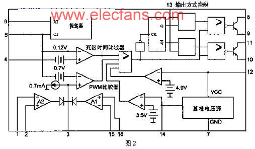 死區時間由4腳電壓來設定,範圍為0~3.3V之間。誤差放大器A1作為輸出電壓取樣誤差放大,結果通過PWM比較器控製脈寬使輸出電壓穩定。誤差放大器A2作為保護控製用,15腳接參考電壓5V(由14腳提供),16腳為控製輸入。在開機保護、過溫或過流保護時,16腳為高電平,這時,誤差放大器A2輸出高電平,該電平高於振蕩器三角波電平幅值,而使驅動器沒有驅動脈衝輸出,負載安全停電。