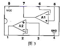 安全保護電路由KIA358電路來完成。出現異常情況時向TL494的16腳提供高電平。KIA358為雙運放電路(如圖3)。