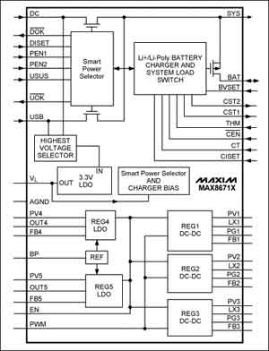 因為MAX8671X可以無縫管理USB和交流適配器電源,使得製造商能夠省去AC/DC牆上適配器充電零配件,從而降低了係統成本。其集成了眾多功能:電池充電器、適配器-USB-電池開關、係統電壓調節以及各種檢測功能(見圖1)。5路獨立的集成穩壓器(3路2MHz開關降壓型調節器,效率高達96%;2路低靜態電流的線性穩壓器)可以為多個子係統提供高效供電。