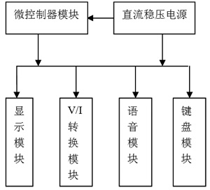 本設計采用單片機作為主要控製部件,通過鍵盤預置輸出電流值並采用液晶模塊實時顯示。整個係統硬件部分由微控製器模塊、電壓-電流轉換模塊、鍵盤模塊、顯示模塊、直流穩壓電源模塊和語音提示模塊組成。係統結構框圖如圖1所示。