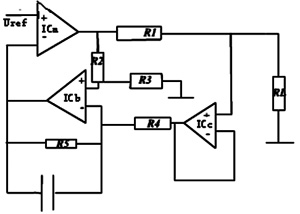 電壓-電流轉換模塊的組成還有另外一種方案,采用3個運放構成輸出電流可變的電流源,如圖3所示。輸出電流I=Vi/R1,為使R1兩端的電壓保持恒定,由差分放大器IC1b通過射隨器IC1c監測R1兩端的電位,此電位經IC1b的7腳加到比較器ICa的反相輸入端與Vref比較。比較結果使比較器的輸出端變化,直到平衡為止,即Vr1=Vi。電路中的電容用於補償ICa的頻率,減少控製環路的延時。隻要R1=R2=R3=R4=R5,此電路的性能較好。但此電路的帶負載能力不強,環路延時補償對電路的穩定有較大影響。